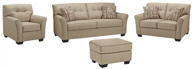 Stretch out in style with this 4-piece sofa, loveseat, chair and ottoman set. Tailored touches including flared armrests and tufted back cushioning infuse an upscale sensibility, while the textural tan chenille fabric is loaded with neutral sophistication. What a brilliant way to bring everyday luxury to your living room, family space or bedroom retreat.Read More