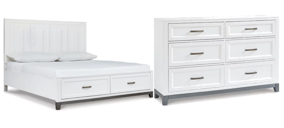 Includes panel bed (headboard, storage footboard, rails, roll slats) and dresser