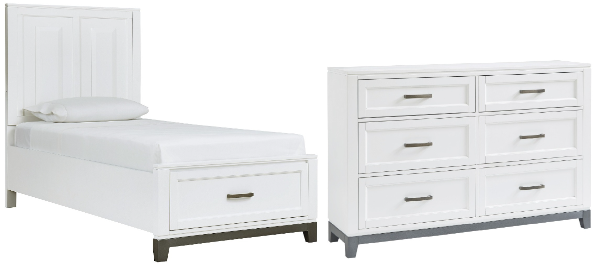 Includes twin storage panel bed (headboard, storage footboard and rails) and 6-drawer dresser