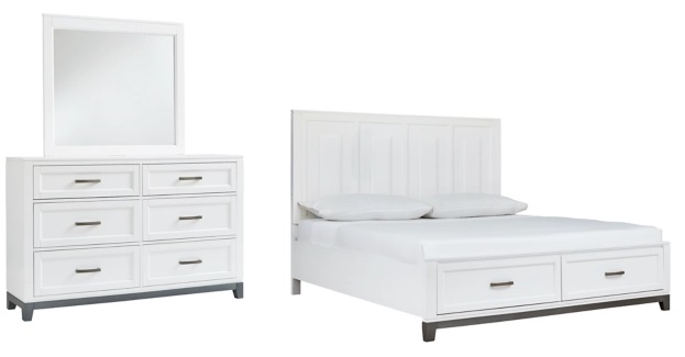 Includes king panel bed with 2 storage drawers (headboard, storage footboard, rails, roll slats) and 6-drawer dresser with mirror