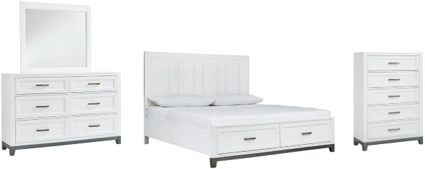 Includes queen panel bed with 2 storage drawers (headboard, storage footboard, rails, roll slats), 6-drawer dresser with mirror, and 5-drawer chest