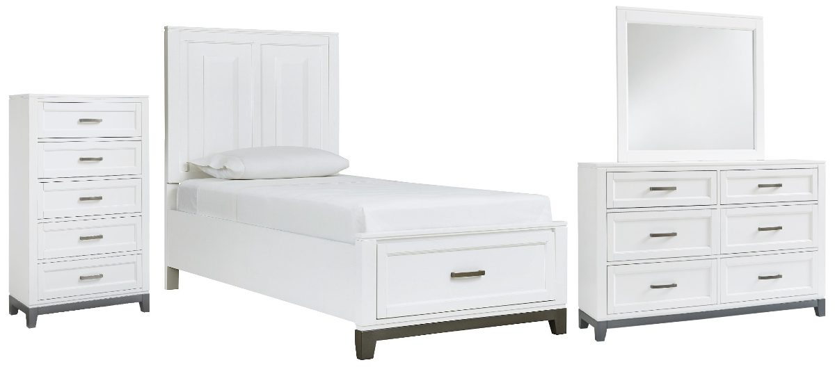 Includes twin storage panel bed (headboard, storage footboard and rails), 6-drawer dresser with mirror, and 5-drawer chest