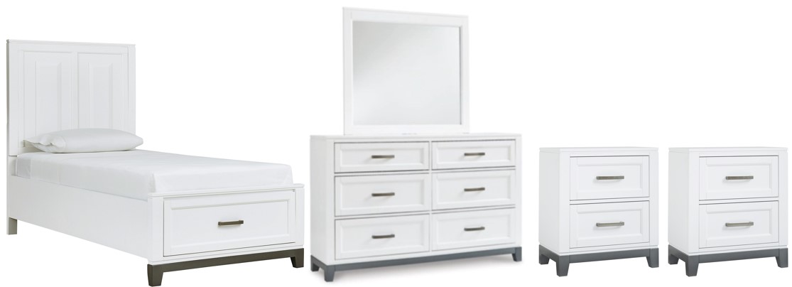 Includes full panel bed (headboard, storage footboard, rails, roll slats), dresser with mirror and two nightstands