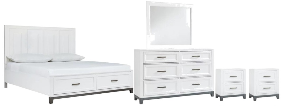 Includes panel bed (headboard, storage footboard, rails, roll slats), dresser with mirror and two nightstands