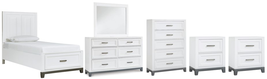 Includes twin bed (headboard, storage footboard and rails, dresser with mirror, chest and two nightstands