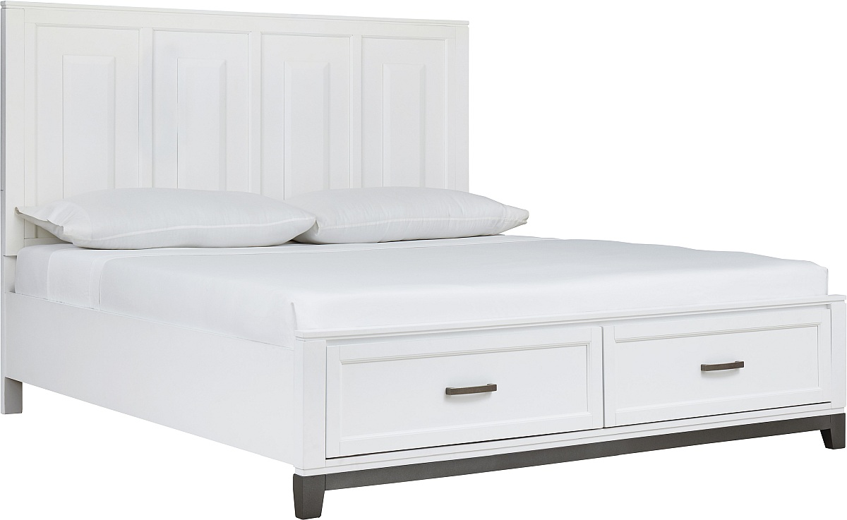 Casual design with timeless Shaker styling. Cases feature picture framed drawer fronts and floating top design. Made with solid wood components and engineered wood. Painted white finish with contrasting raw steel colored bases. Drawer feature dovetailed construction with metal center guides. Metal bar pulls with a satin nickel colored finish. Paneled headboard design with picture framed details and low profile storage footboard. Roll slats included.