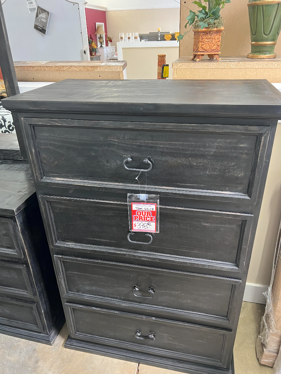 This rustic style chest of drawers has a charcoal black finish.Read More