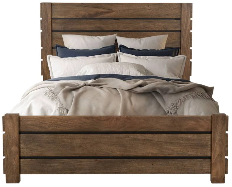 The slatted headboard and footboard, designed for timeless appeal, is carefully crafted to achieve a sleek and modern look. The metal accents between the slats on both add an industrial touch, enhancing the overall design. This versatile bedroom set complements a wide range of interior styles, making it an ideal addition to any bedroom.