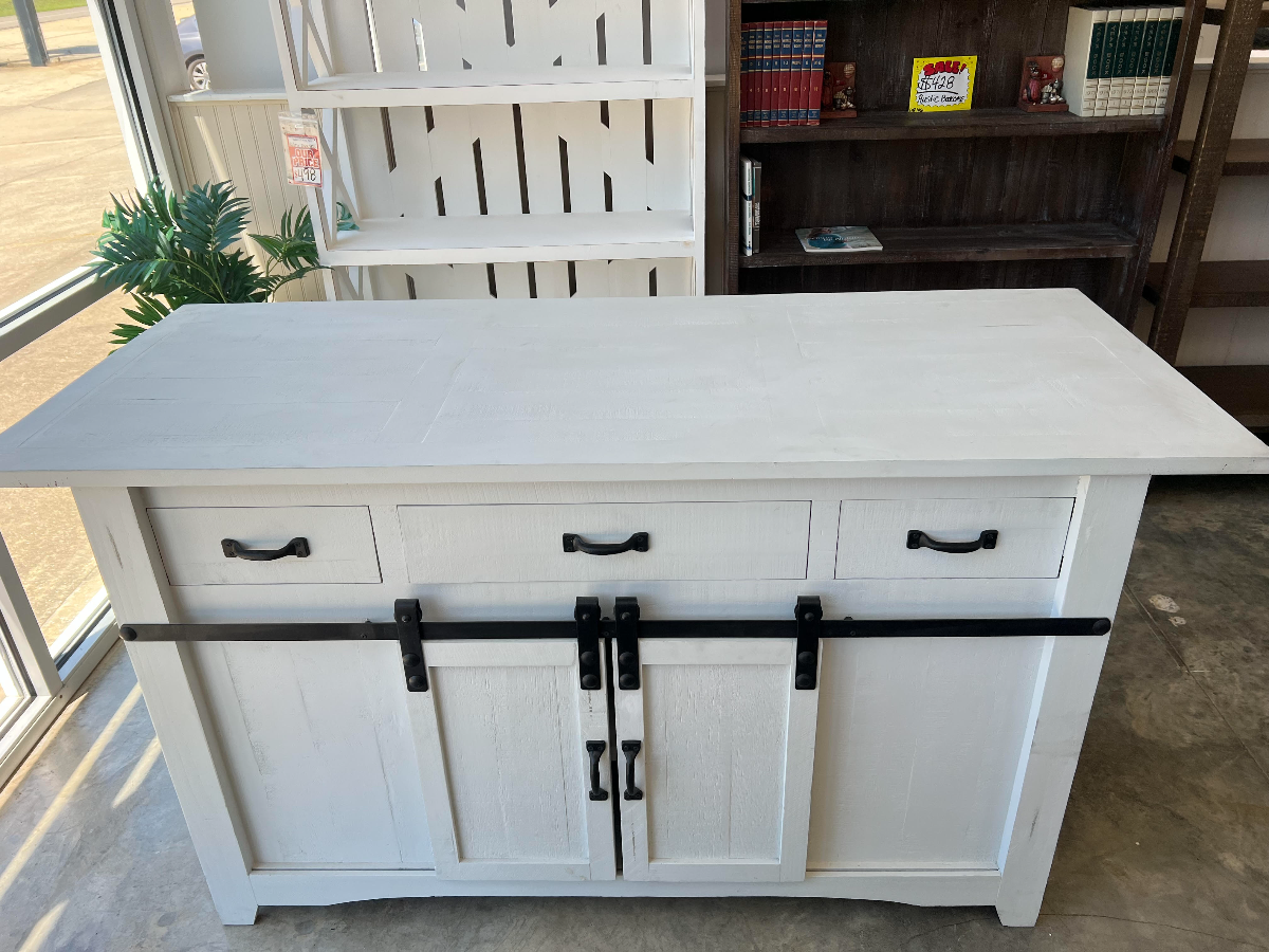 This rustic style island is white with wood rub. It features sliding barn doors with storage!Read More