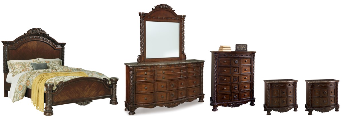 Includes panel bed (headboard, footboard and rails), dresser with mirror, chest and two nightstands,
