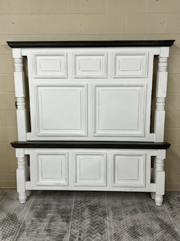 Rustic queen bed. White with gray accents.Read More