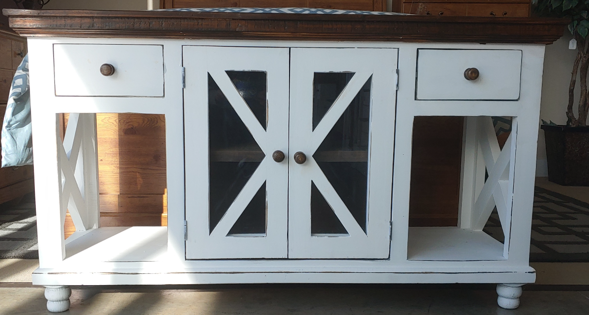 Rustic sofa table in antique white with brown top.Read More