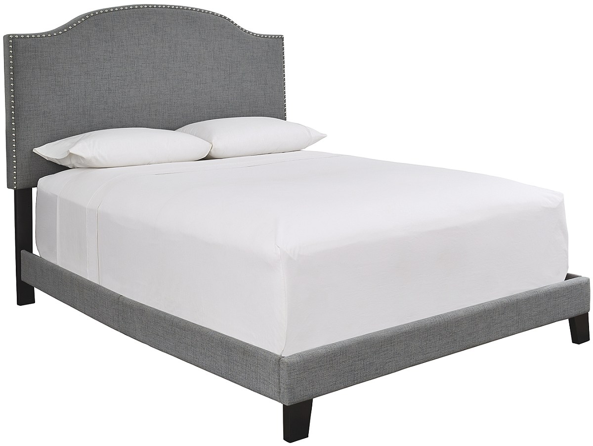 B080-1XX (Gray) /- 2XX (Charcoal) features arched headboard with nail head trim. B080-7XX (Gray) /-8XX (Charcoal) features arched style headboard with frame detail and button-tufted detail. All beds do not require box spring.