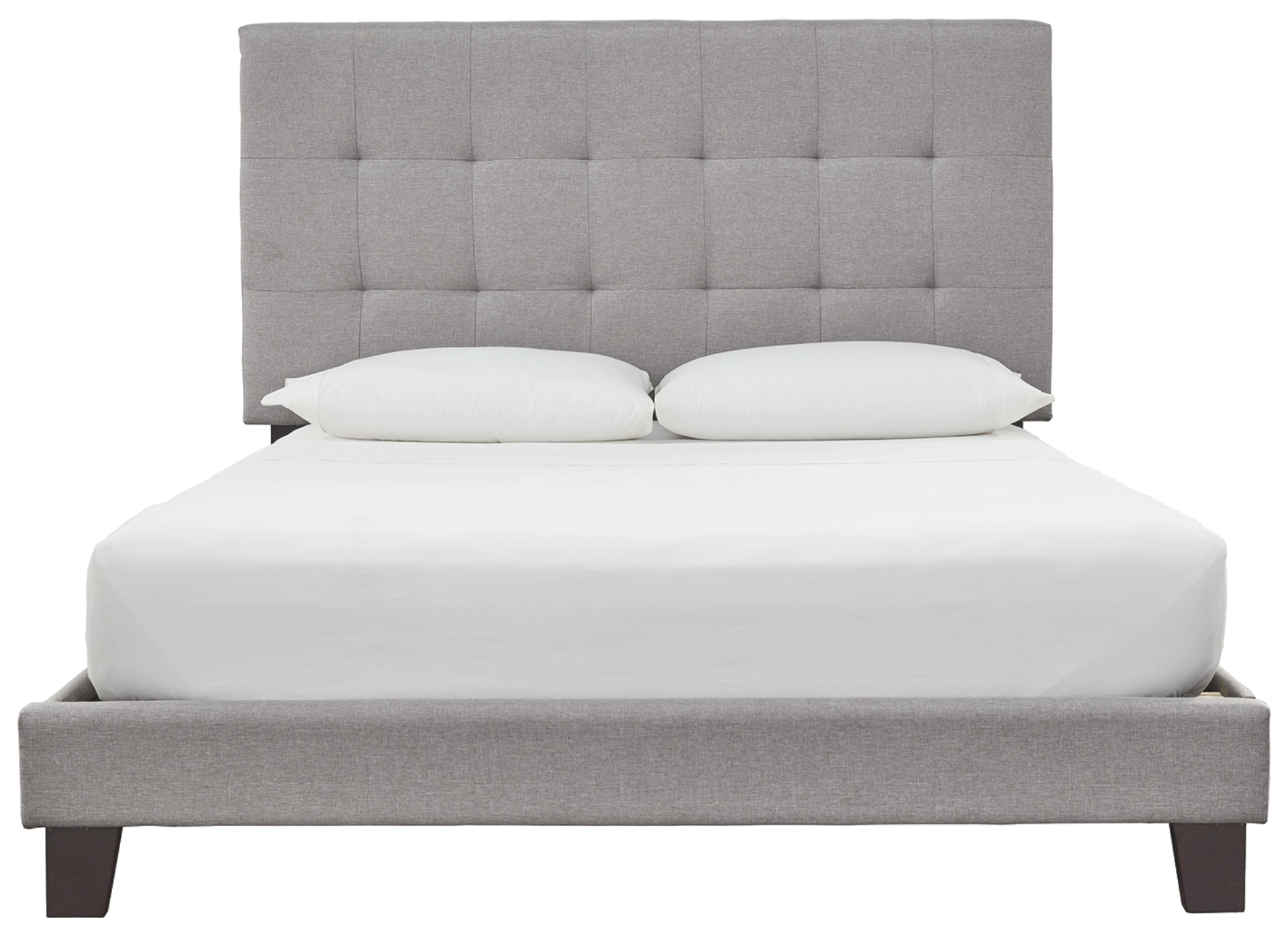 B080-181/-182 (Gray) / B080-281/-282 (Charcoal) features arched headboard with nail head trim. B080-781/-782 (Gray) / B080-881/-882 (Charcoal) features arched style headboard with frame detail and button-tufted detail. All beds do not require box spring. B080-381/-382 features a gray woven polyester fabric. B080-481/-482 features a brown faux leather. B080-581/-582 features a gray woven polyester fabric. B080-681/-682 features a light brown faux leather.