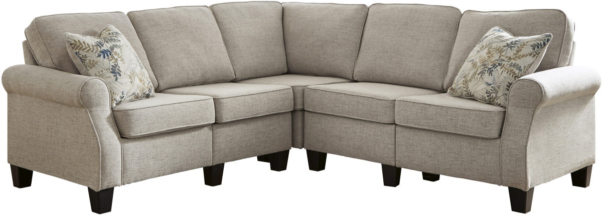 Whether your home is adorned with contemporary or American classic furnishings, this 4-piece sectional has a timeless sense of elegance that’s sure to fit right in. Signature elements include roll arms and cutaway side profiling for added flair. Ultra neutral and plush to the touch, the sesame-hued fabric is a brilliant reflection of your good taste. Rounded cornering gives the box cushions a softened, tailored aesthetic. Designer pillows pop with colorful patterns to round out the inviting look.Read More