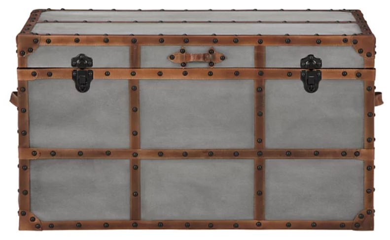 If you appreciate a little extra storage space, you'll love this cool, retro trunk. Perfect for the entryway, guest room or den. Even better as a casually cool coffee table. Accent Trunk. Constructed of Engineered Wood and Cotton Canvas in Gray Finish. Black Leather and Black Finished Metal Handles and Hardware. Hinged Top with Storage.