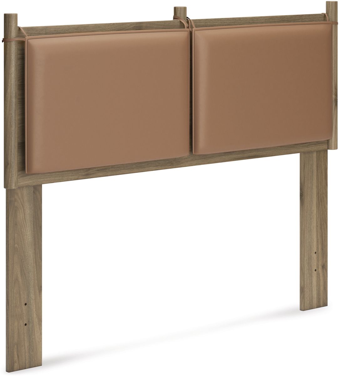 Dare to take minimalism to the max. This full panel headboard has a richly relaxed feel thanks to its honey brown finish over replicated wood grain. The optional reversible cushions are an inventive element, allowing you to choose faux leather or gray fabric to suit your space.Read More