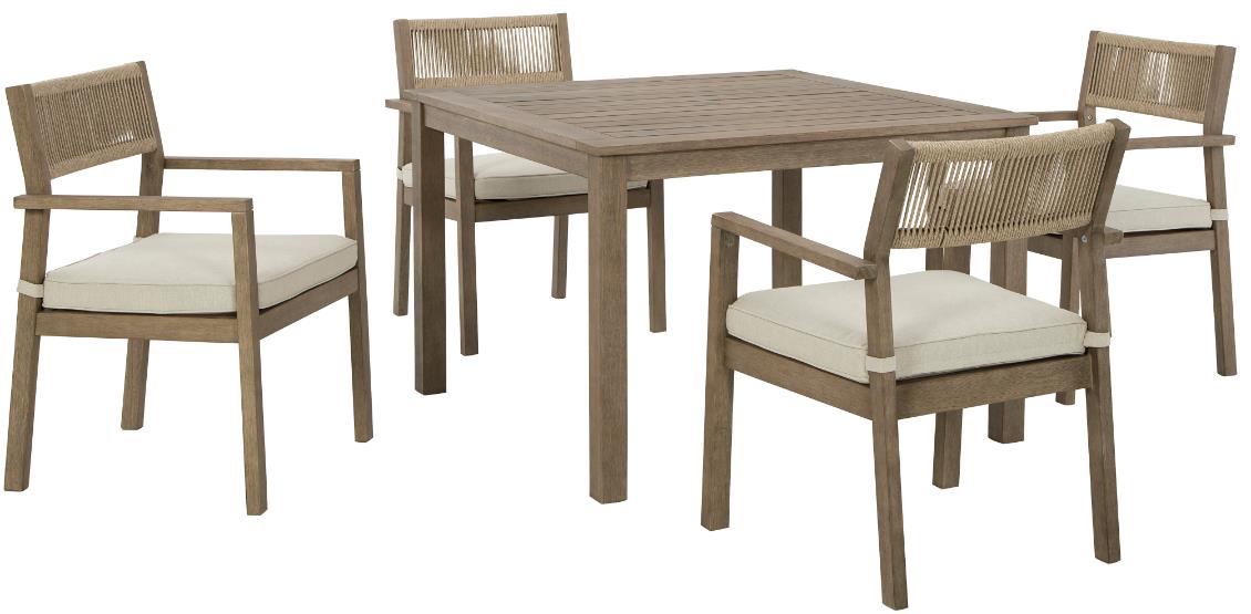 Includes square dining table and four arm chair with cushion