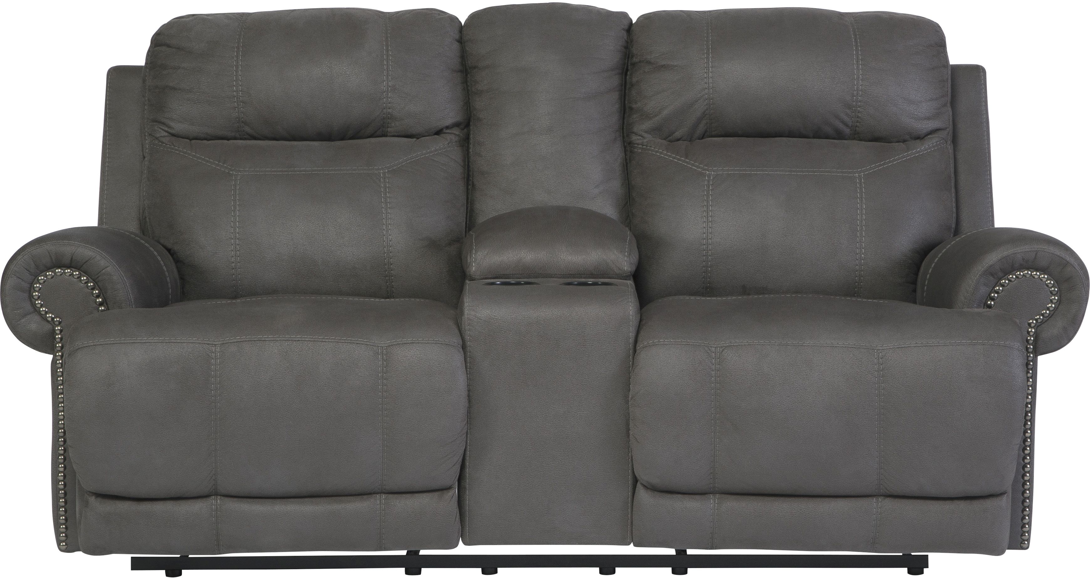 Sparing that "puffy" look you might expect from a recliner, this reclining loveseat with console doesn't hold back when it comes to contemporary style. Subtle touches, such as sporty jumbo stitching, nailhead trim, and a "weather worn" effect on the upholstery, give this handsome piece a buttoned-up appeal and a fresh feel.Read More