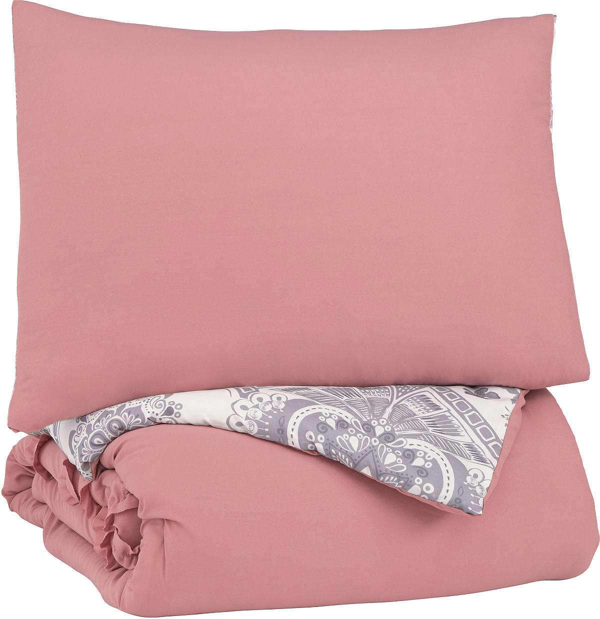 Loaded with high-style twists and turns, this comforter set is the essence of fresh, fun, youthful style. Solid pink with ruffle stripe detail that reverses to a mandala and lotus design in pink, white and gray. Perfect for your tween or teen's fashion sense. 3-Piece Comforter Set - Includes Comforter and 2 Shams (1 in Twin). Solid in Pink with Ruffle Stripe Detail. Reverses to Mandala and Lotus Design in Pink, White and Gray. Polyester Microfiber Cover with Polyester Filling. Machine Washable.