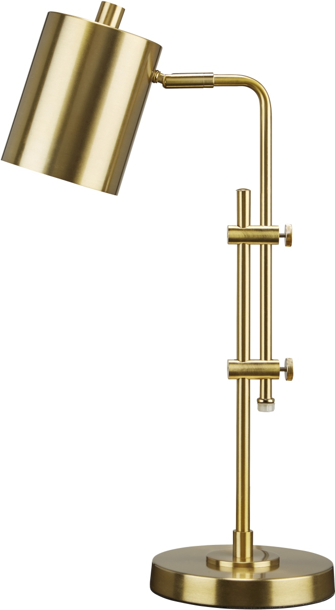 Inspired by contemporary lighting designs, this metal desk lamp features a slender brass-tone profile with a simple metal shade. An adjustable neck and shade provide targeted illumination.Read More