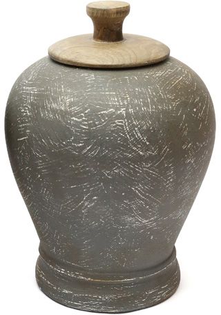 This antique-style Barric jar is handcrafted and features a terracotta body, wooden top, detailed scratches, and a black finish.