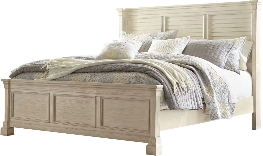 Made with Acacia veneers and solids finished in a trendy textured antique white color. Dovetailed drawers feature fully finished drawer boxes and metal ball bearing side glides. B647-57 and -58 shelter styled panel headboard has lattice design headboard panel. B647-77 and -78 shelter styled panel bed features a louvered headboard panel. Cases feature framed drawer fronts, break-front pilasters and profiled base mouldings for added dimension. An accent night table features door cabinet storage with an AC power supply and USB charging ports for powered devices.