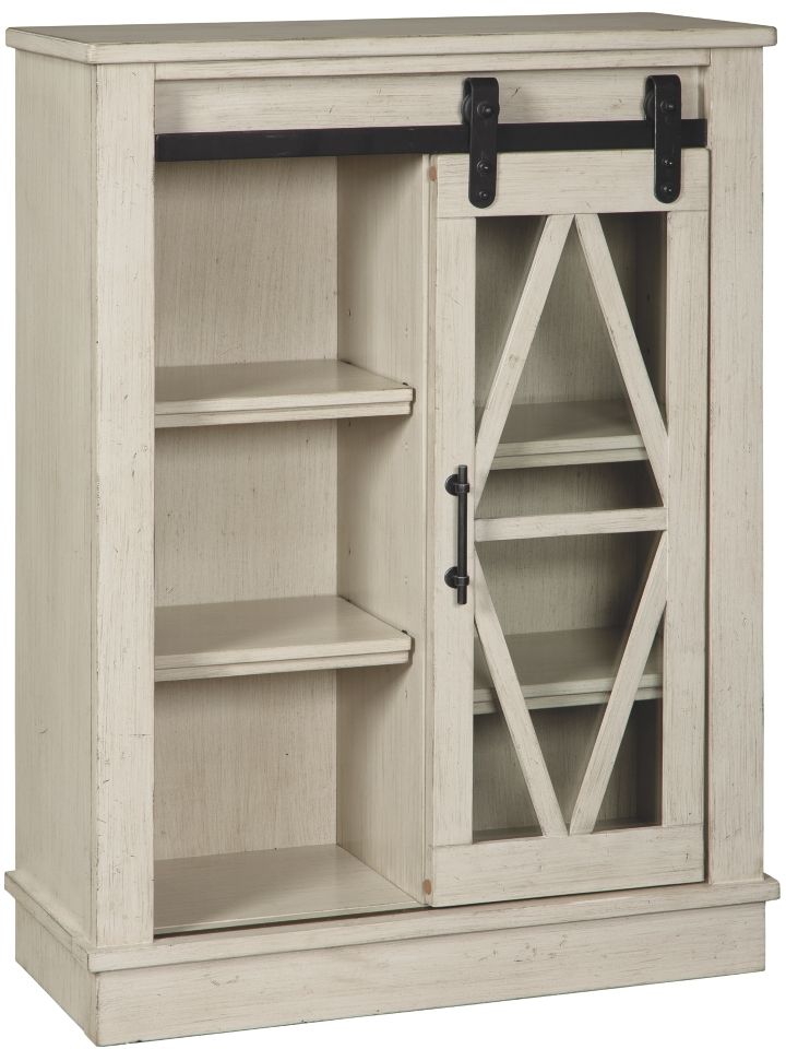 This Bronfield accent cabinet in antique white provides a modern farmhouse feel with 4 adjustable shelves behind a sliding barn door and a glass panel front.