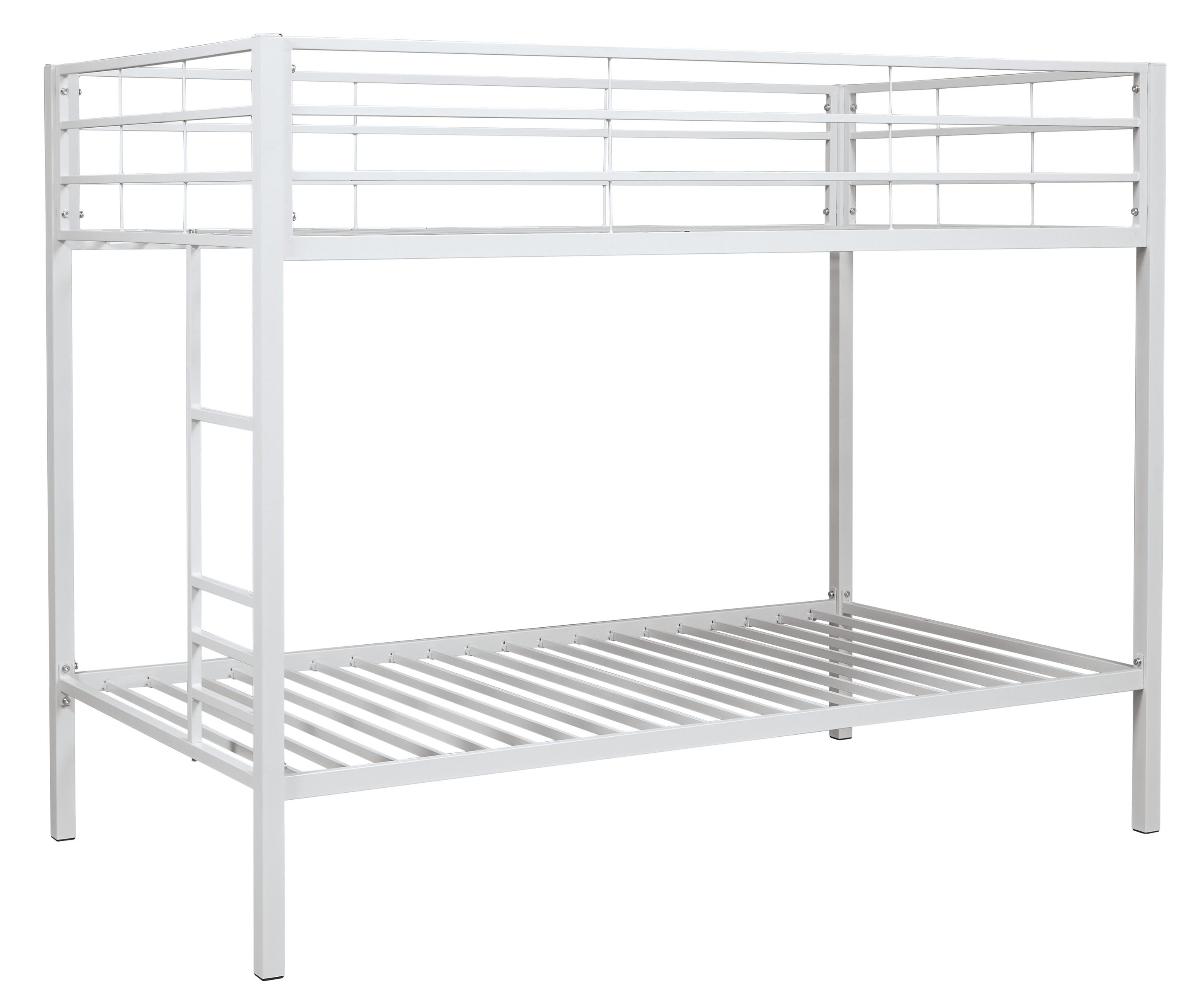 Twin over Twin metal bunk bed with strong steel framed mattress support. Guard rails on top bunk and integrated ladder on the side. Offered in white and black powder coat finishes. B075-159 is black; B075-259 is white.