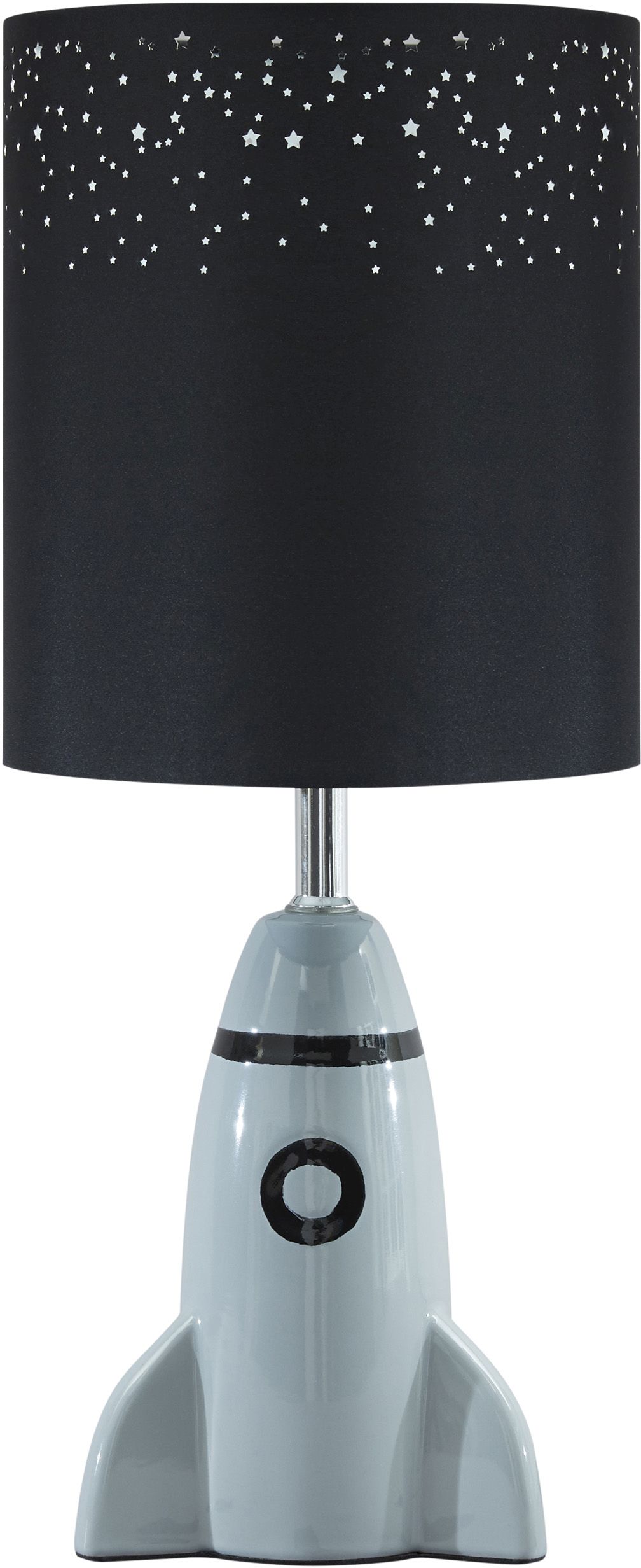 The Cale table lamp features a rocket ship ceramic base and a lampshade with star-shaped cutouts that casts a sense of wonder and outer space around the room.