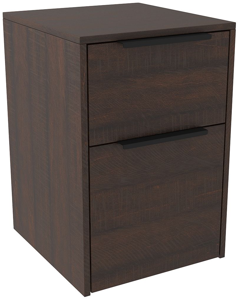 Modern farmhouse design with an Urban attitude. Made with a paper laminate featuring a replicated rough sawn wood grain and engineered wood substrate. Black metal frames. Each piece is thoughtfully designed to offer style and function to any home office. Drawers use ball bearing side glides for smooth operation. Doors use European style hinges.