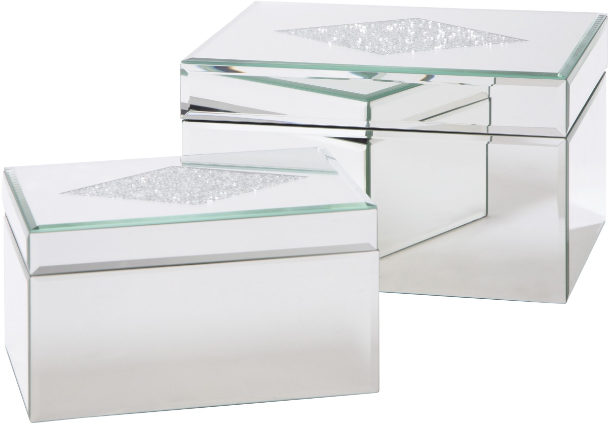 This set of two keepsake boxes make storage so glamorous. The cut-glass mirror finish and acrylic beaded design on top is completed inside with a black cotton lining. The perfect place for your dearest keepsakes while adding a touch of sparkle to your decor.Read More