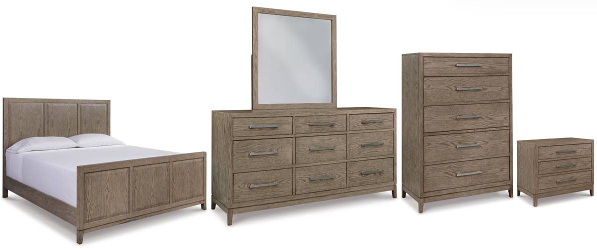 Includes king panel bed (headboard, footboard, rails), dresser, mirror, chest and nightstand