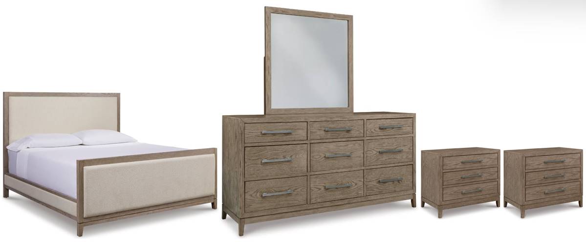 Includes: King upholstered panel bed (headboard, footboard and rails), dresser, mirror, and two 3-drawer nightstands