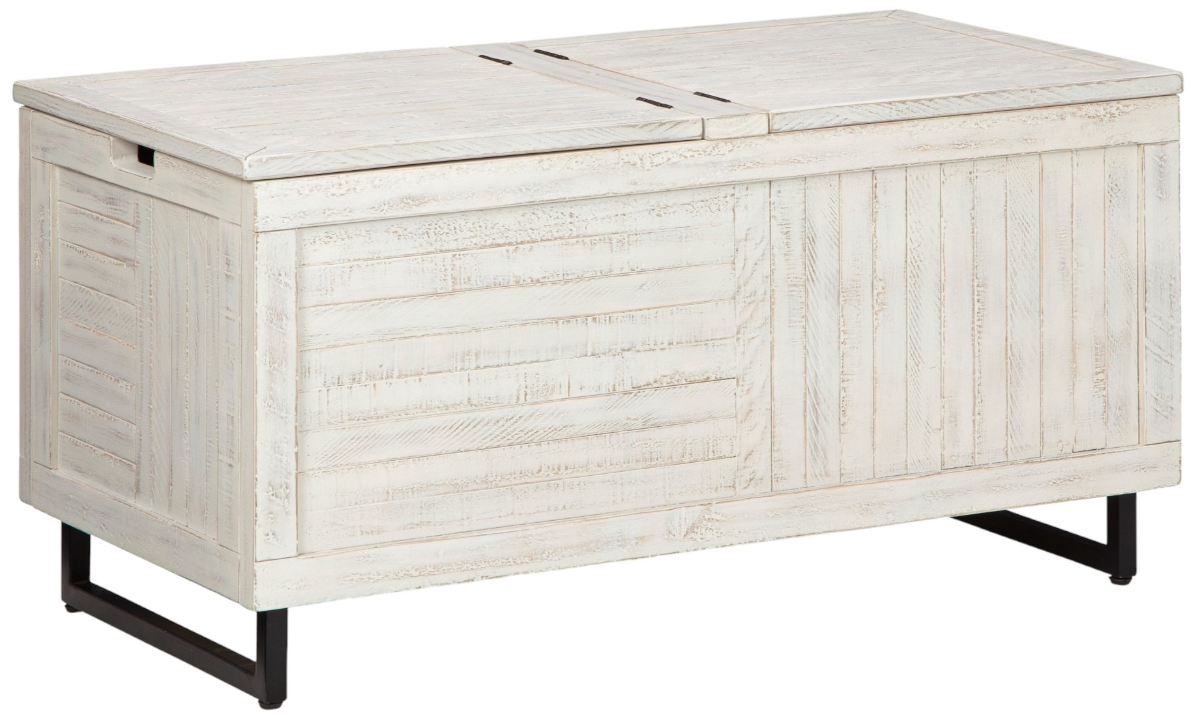 The Coltport Storage trunk is constructed of veneer, solid, and engineered woods in a distressed white finish. This trunk features striped sides and front, black metal legs, and a dual hinged top with storage.Read More