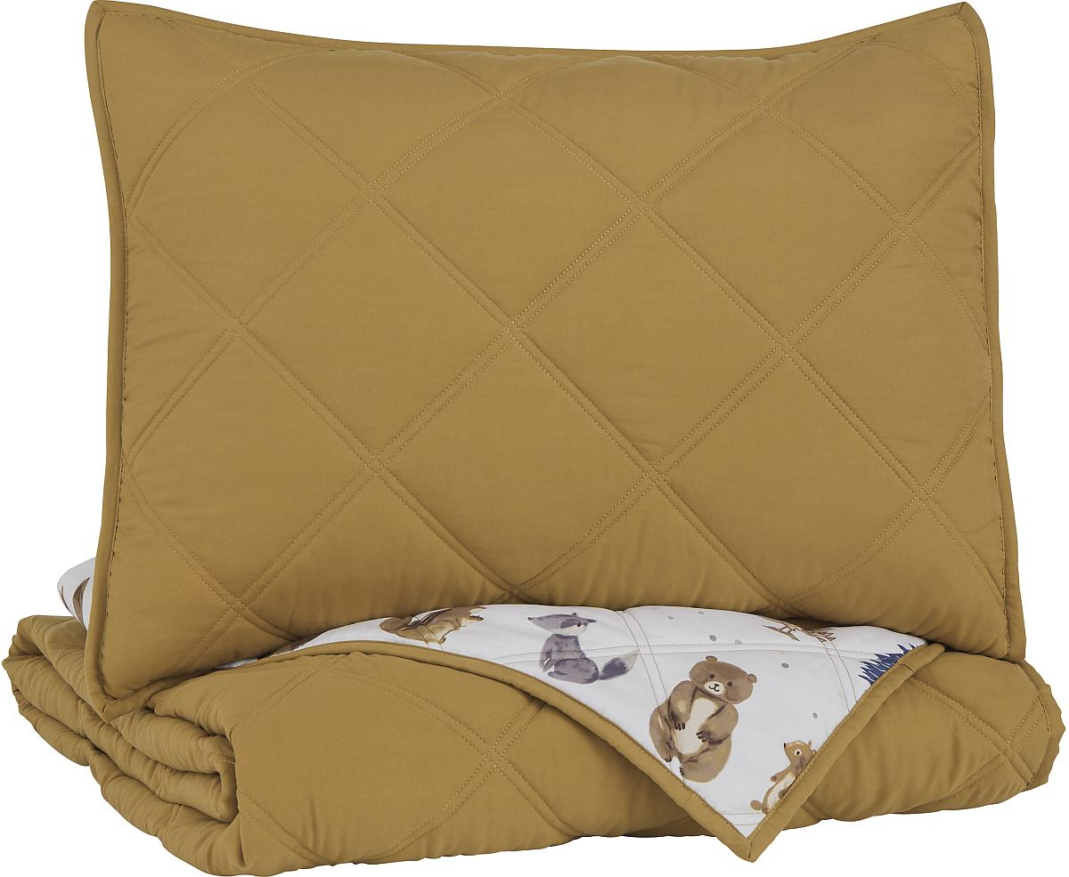 Bring the outdoors inside with this comforter set. The solid golden brown stitched geometric pattern reverses to a woodland animal design in shades of brown, navy and white. Perfect for the nature lover in your life. 3-Piece Quilt Set - Includes Quilt and 2 Shams (1 in Twin). Solid in Golden Brown with Stitched Geometric Pattern. Reverses to Woodland Animal Design in Shades of Brown, Gray, Navy and White. Polyester Microfiber Cover with Polyester Filling. Machine Washable.