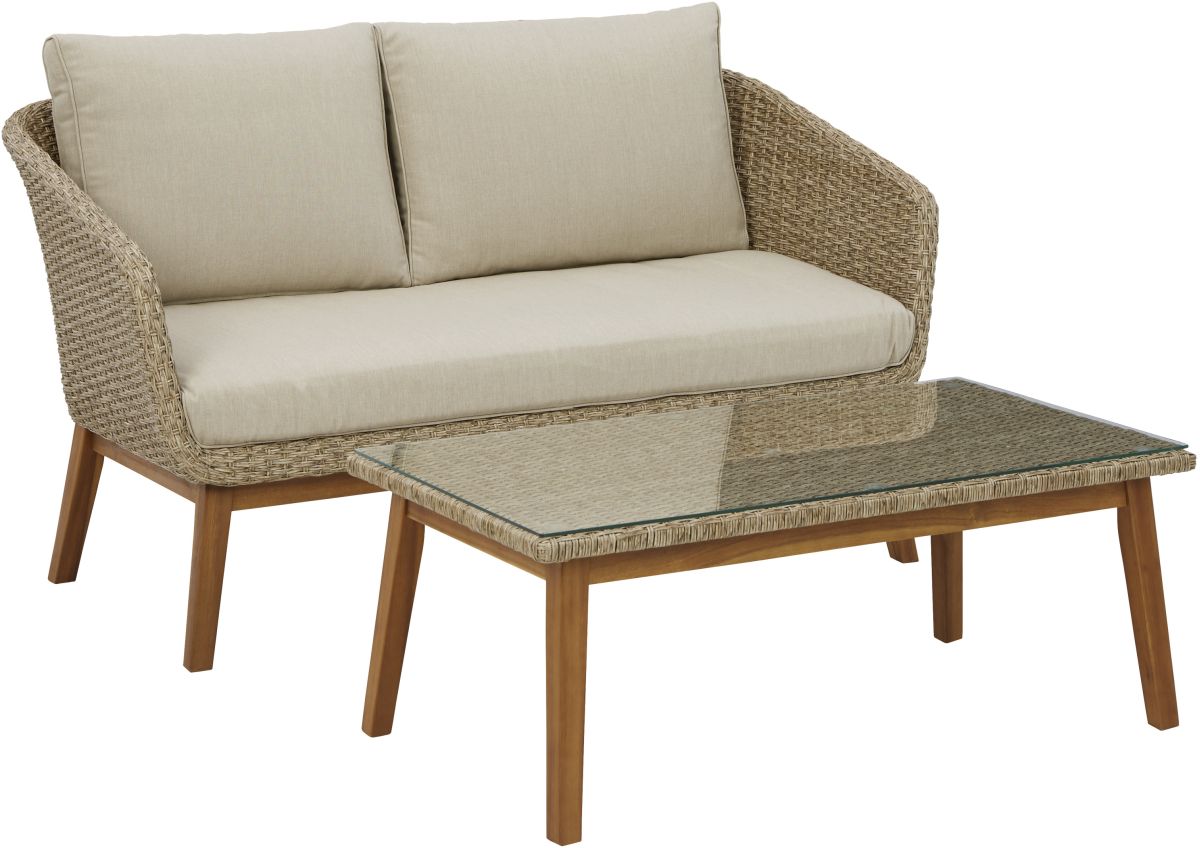 Turn your outdoor space into a high-style hideaway with this 2-piece outdoor loveseat and table set. Clearly for those with an eye for fine design, this sleek, chic outdoor furniture set is quality made to withstand the elements. What looks like traditional wicker is the next best thing: resin wicker woven over rust-proof aluminum for exceptional durability and worry-free living. Acacia wood legs, a tempered glass tabletop and easy-breezy Nuvella®/olefin wrapped cushions enhance its appeal.