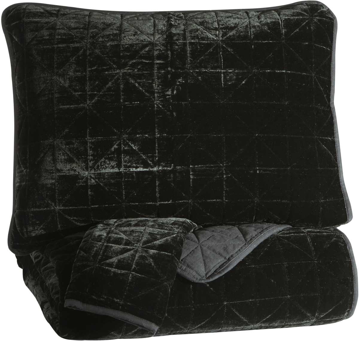3-Piece quilt set - includes quilt and 2 shams. Velvet solid in black with stitched diamond design. Viscose/polyester blend face with cotton reverse and polyester filling. Machine washable.Read More