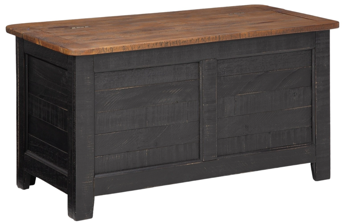 The Dashbury storage trunk is constructed of veneer, solid, and engineered woods in distressed black and brown finish. The distressed planked effect is on the front and sides. This trunk features a hinged top with storage.Read More
