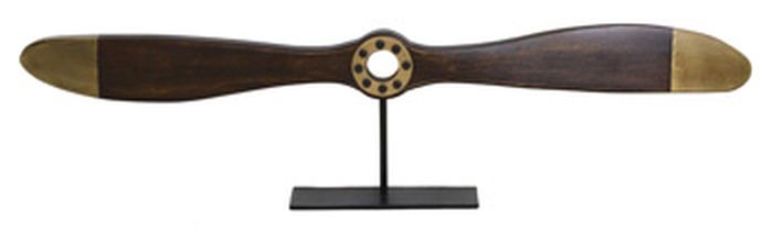 The Devyn brown sculpture is made from antique brass, metal, and wood and resembles an airplane propeller.