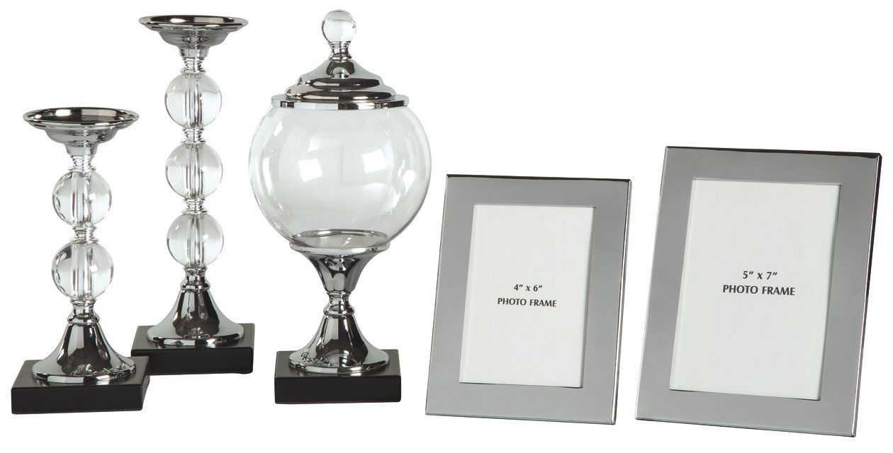 Bring some shine to your decor with this 5-piece accessory set. Candle holders made of real crystal and silvertone metal give your space a high-end appeal. You’ll love putting your most adored photos in the silvertone frames. Step things up one more level with the glass and metal globe-shaped box. What a great mix for the bold interior decorator.Read More