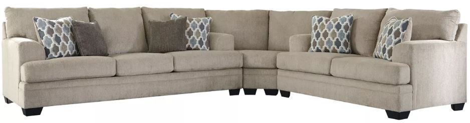 This contemporary 3-piece sectional has comfort written all over it. From the plush cushions to the textured fabric, it’s a total winner for relaxation. Throw pillows disrupt the solid slate gray color. Four with a dimensional pattern in blue, browns and white, and the other two in a sleek slate gray.