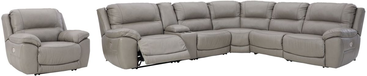 Load up on comfort in a cool, clean-lined and contemporary way with this 6-piece power reclining sectional and power recliner package in a neutral gray hue. Rest assured, you'll enjoy the feel of real leather everywhere your body touches (real leather interior seating/matching faux leather exterior).Read More