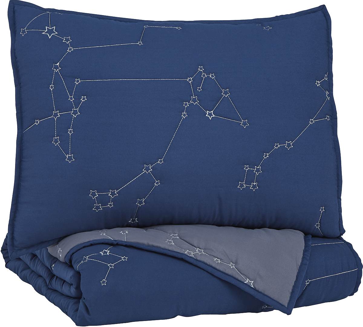 Create room for self-expression with this fun bedding set. Encourage your child’s interest in the stars and delight them with this comforter set. Solid navy and white embroidered constellations on one side reverses to gray with white embroidered constellations on the other. Rest assured, they’ll happily drift off to dreamland in a space that’s uniquely theirs. 3-Piece Quilt Set - Includes Quilt and 2 Shams (1 in Twin). Solid in Navy with White Embroidered Constellations. Reverses to Solid in Gray with White Embroidered Constellations. Polyester Microfiber Cover with Polyester Filling. Machine Washable.
