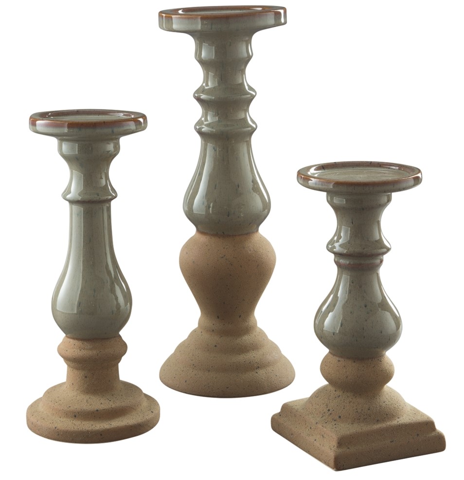 This Emele 3-piece candle holder set is made of glazed ceramic and features a two-tone look of light green and brown. Perfect as a set or spread out for a cohesive look, brighten up your space with this candle holder set.