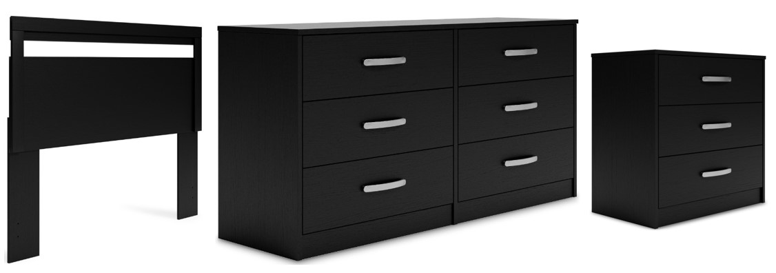 Practical and attractive, this bedroom package blends seamlessly with modern decor and makes a smart addition. Its linear profile is enhanced by a matte black finish with subtle replicated wood grain. Drawers in the dresser and chest slide easily on metal ball bearings and can be used to keep your bedroom neat and organized.Read More