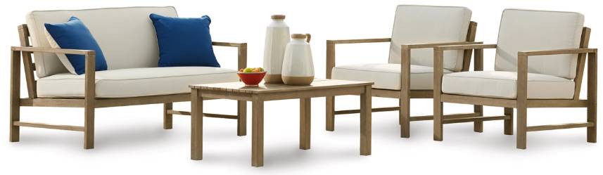 With its sleek lines, gorgeous driftwood tone and cushioned comfort, this 4-piece outdoor package can make your outdoor space feel more like an upscale resort. Made for looks and longevity, the high-quality ensemble is built from eucalyptus wood treated to a deluxe embossed finish to brave the elements.Read More