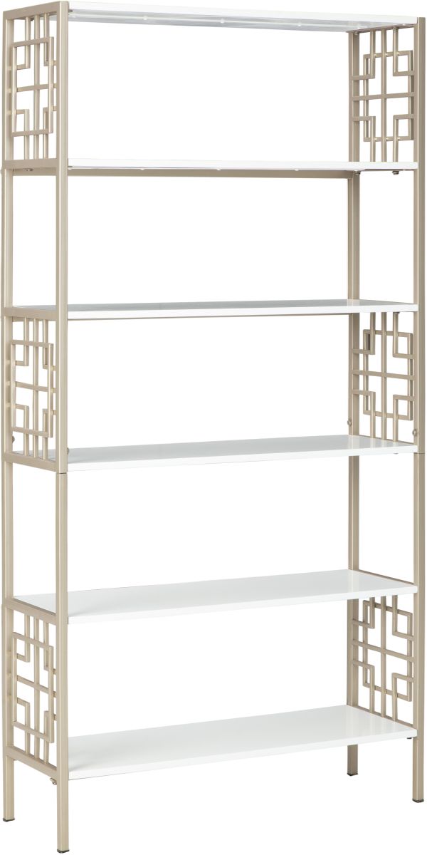 Showcase your book collection or decorative pieces with this dynamic bookcase. The geometric metal designs in a champagne finish that line the sides of the bookcase add the contemporary feel you are looking for. The six fixed shelves in a white finish provide the perfect amount of display or storage space.Read More
