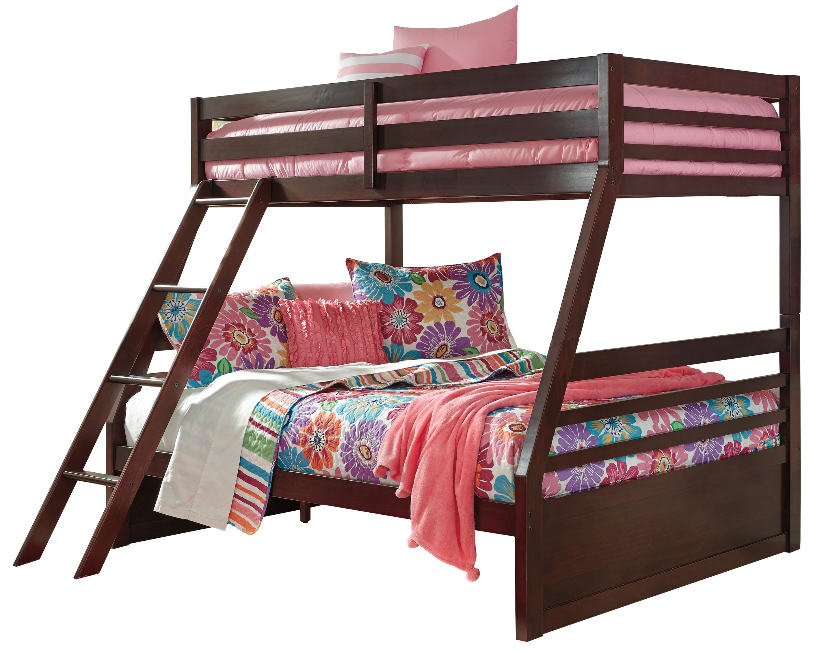 Save space while making bedtime a lot more appealing with this twin/full bunk bed. Sporting a clean-lined contemporary design, Halanton is kid-friendly furniture with a touch of grown-up sophistication. This solidly made bed has protective guard rails with a fixed ladder for easy top bunk access. Mattresses sold separately.