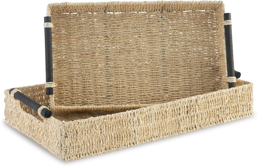 This tray set with cutout wood handles adds a lovely touch of natural appeal to nearly any room. Woven from palm leaf in a light neutral finish, these lovely trays make a great pick for everything from displaying decorative elements to storing essentials like remotes, game controllers and much more.Read More